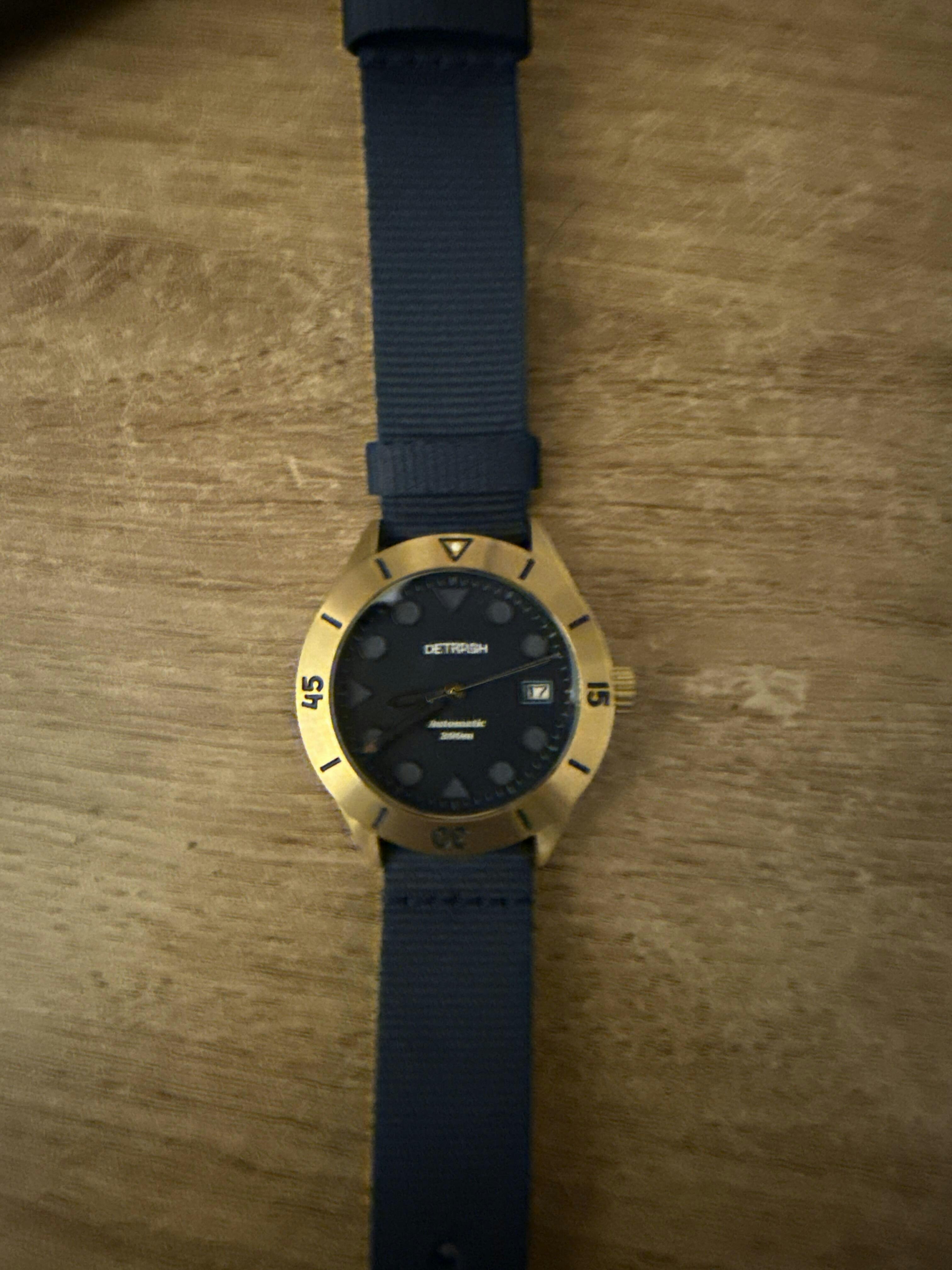 "I love gooooold".... This is the first Detrash PVD-Gold coated dive watch. It was going to be called 'Auric' in honour of the James Bond Nemesis, Goldfinger, but then the name "Au.M.G." hit like a golden lightening bolt from the muses.